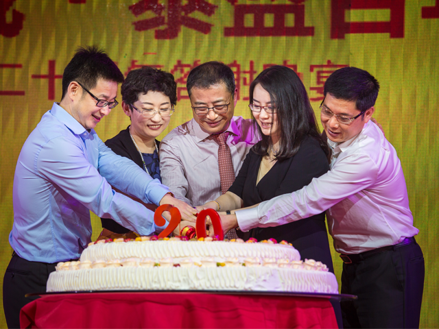 切蛋糕环节,华泰集团董事长陈先保先生、AG真人平台食品总经理陈冬梅女士、华泰集团副总裁陈奇女士、华邦地产董事长杨青云先生以及华元金融董事长孟虎先生5人同持一把蛋糕刀,缓缓切开华泰二十岁生日蛋糕,场面温馨动人。
